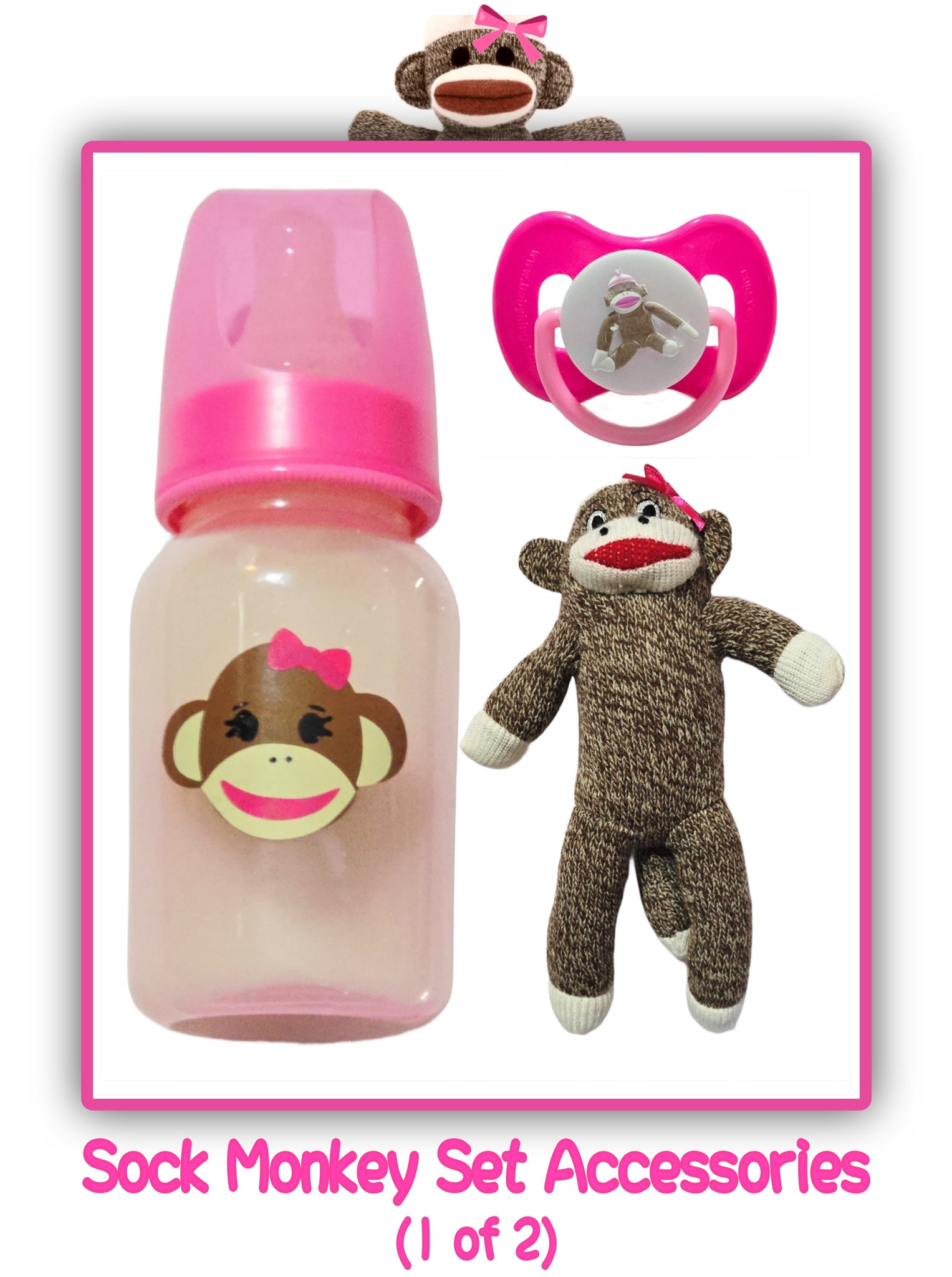 ⭐Matching 4oz Hot Pink Sock Monkey Themed Fake Formula Bottle w/Standard No Hole Nipple (preemie or micro preemie no hole nipple also available)